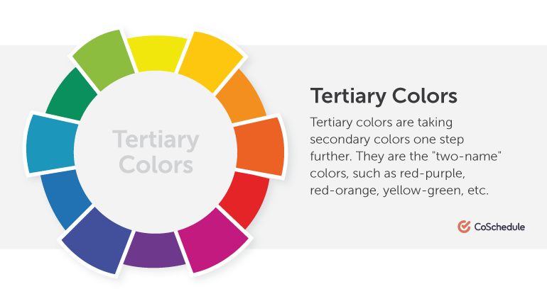 Tertiary colors take secondary colors one step further. They are the "two-name" colors, such as red-purple, red-orange, yellow-green, etc.